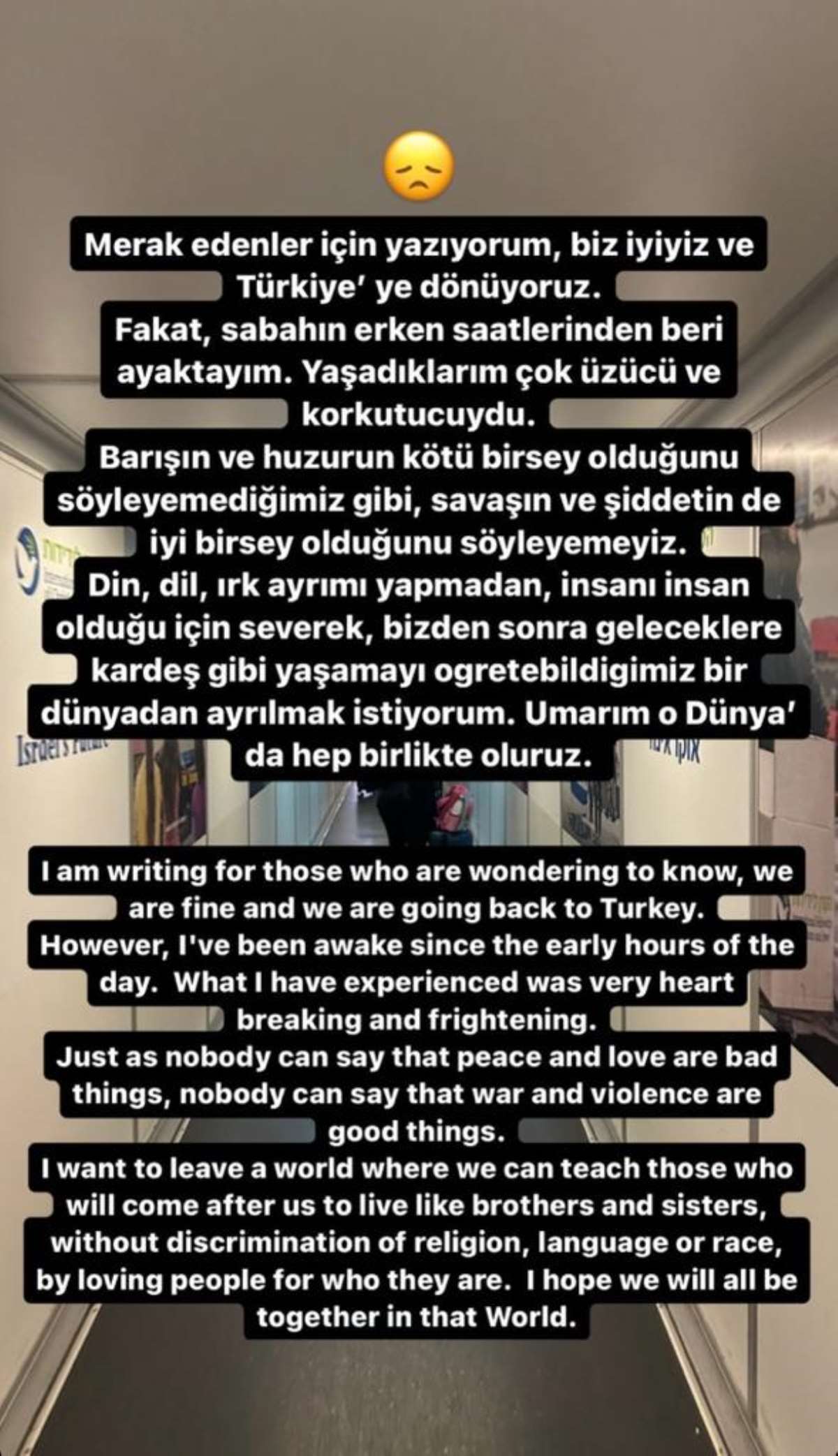 “Merak edenler için yazıyorum, biz iyiyiz ve Türkiye’ye dönüyoruz. Fakat, sabahın erken erken saatlerinden beri ayaktayım. Yaşadıklarım çok üzücü ve korkutucuydu. Barışın ve huzurun kötü bir şey olduğunu söyleyemediğimiz gibi savaşın ve şiddetin de iyi bir şey olduğunu söyleyemeyiz. Din, dil, ırk ayrımı yapmadan, insanı insan olduğu için severek, bizden sonra geleceklere kardeş gibi yaşamayı öğretebildiğimiz dünyadan ayrılmak istiyorum. Umarım o Dünya’da hep birlikte oluruz."