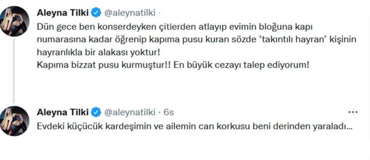 Tilki paylaşımında "Dün gece ben konserdeyken çitlerden atlayıp evimin bloğuna kapı numarasına kadar öğrenip kapıma pusu kuran sözde ‘takıntılı hayran’ kişinin hayranlıkla bir alakası yoktur. Kapıma bizzat pusu kurmuştur. En büyük cezayı talep ediyorum. Evdeki küçücük kardeşimin ve ailemin can korkusu beni derinden yaraladı" ifadelerini kullandı.