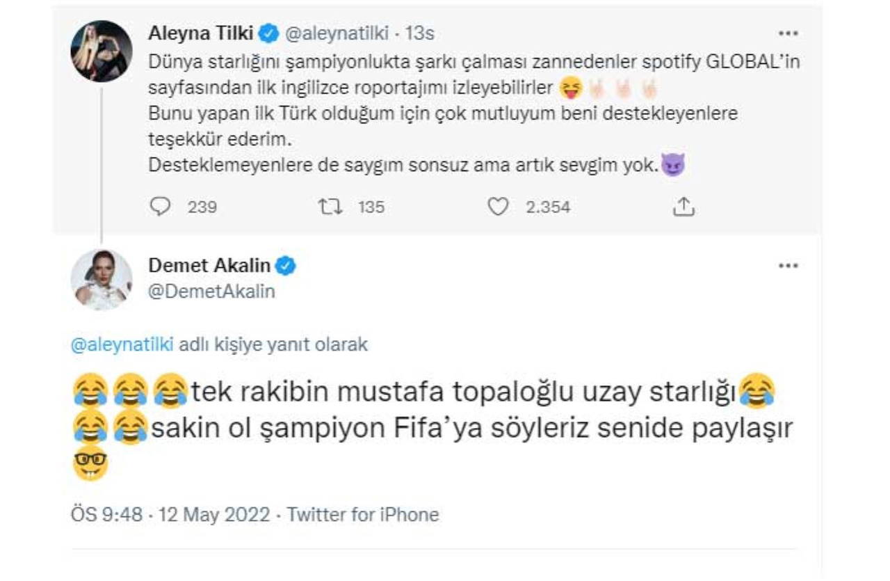 Tilki, Akalın'a Twitter'dan yanıt verdi. Genç şarkıcı, sosyal medya hesabından “Dünya starlığını şampiyonlukta şarkı çalması zannedenler spotify GLOBAL’in sayfasından ilk ingilizce roportajımı izleyebilirler. Bunu yapan ilk Türk olduğum için çok mutluyum beni destekleyenlere teşekkür ederim. Desteklemeyenlere de saygım sonsuz ama artık sevgim yok” paylaşımını yaptı.