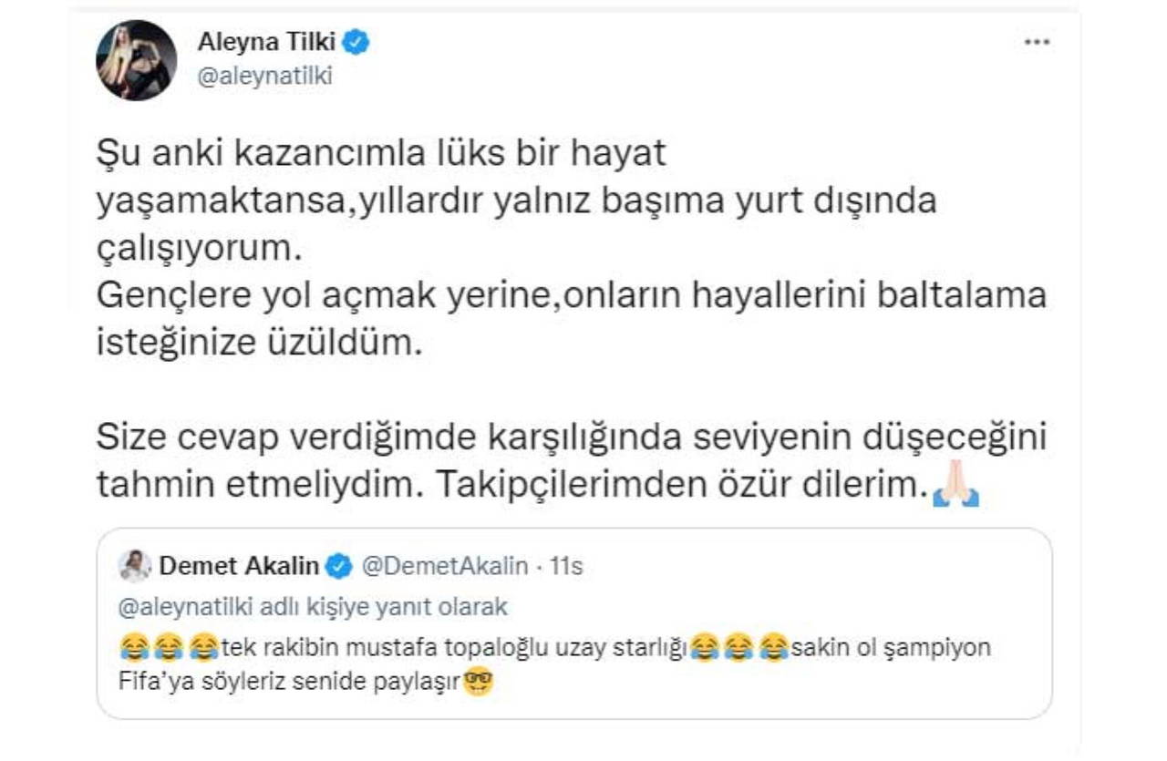 Demet Akalın’ın cevabı üzerine Tilki, “Şu anki kazancımla lüks bir hayat yaşamaktansa,yıllardır yalnız başıma yurt dışında çalışıyorum. Gençlere yol açmak yerine,onların hayallerini baltalama isteğinize üzüldüm. Size cevap verdiğimde karşılığında seviyenin düşeceğini tahmin etmeliydim. Takipçilerimden özür dilerim” ifadelerini kullandı.