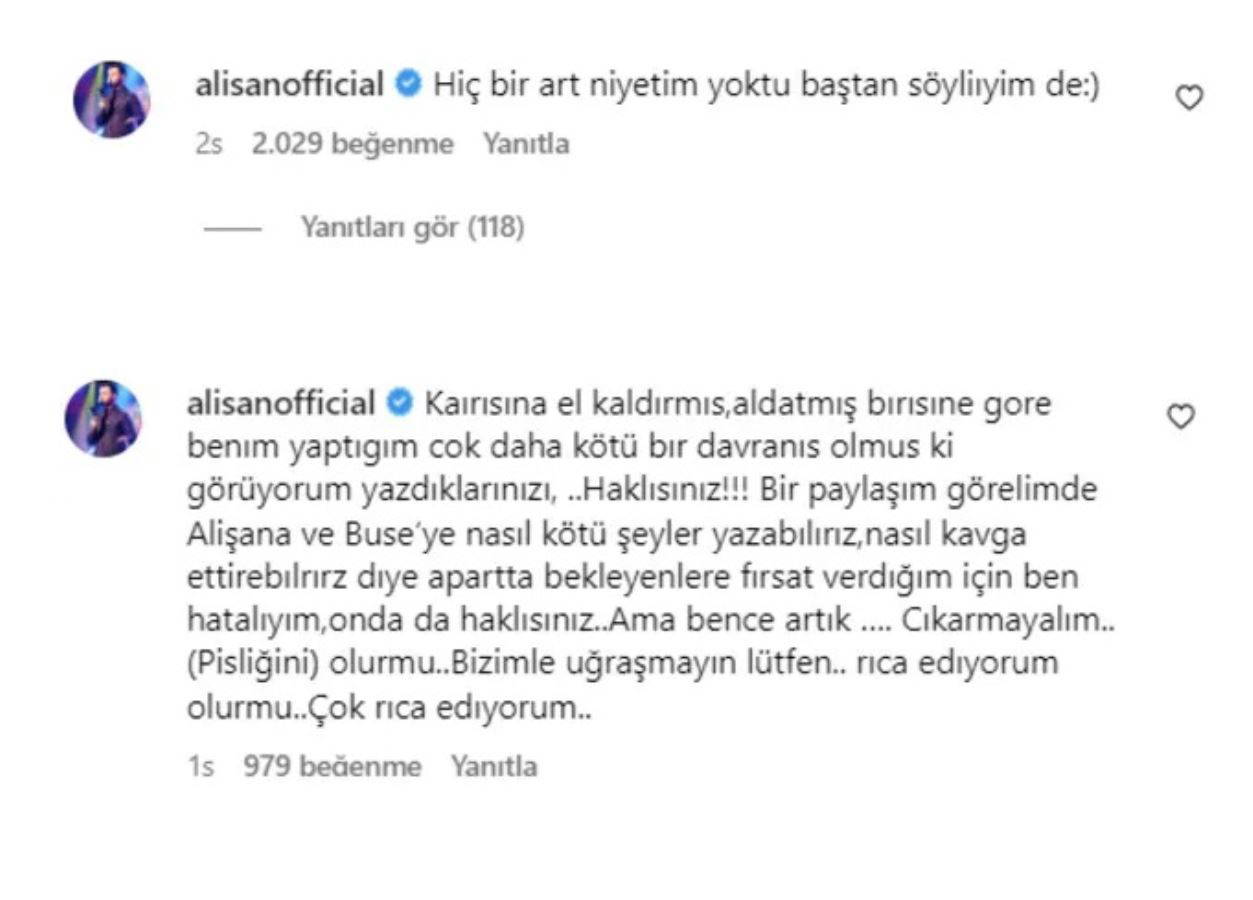 Alişan yapılan çirkin yorumlara; 'Karısına el kaldırmış, aldatmış birine göre benim yaptığım .ok daha kötü bir davranış olmuş ki görüyorum yazdıklarınızı. Haklısınız! Bir paylaşım görelim de Alişan'a ve Buse’ye nasıl kötü şeyler yazabiliriz, kavga ettirebiliriz diye bekleyenlere fırsat verdiğim için ben hatalıyım, onda da haklısınız. Ama bence artık çıkarmayalım..(Pisliğini) olur mu? Bizimle uğraşmayın lütfen.. Rica ediyorum olur mu? Çok rica ediyorum' diye yanıt verdi.