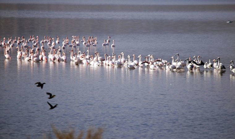 Barajda üç gündür toplu halde bulunan yaklaşık 300 flamingo, burada açlık, soğuk ve yırtıcı hayvanlara karşı kendilerini koruyor.