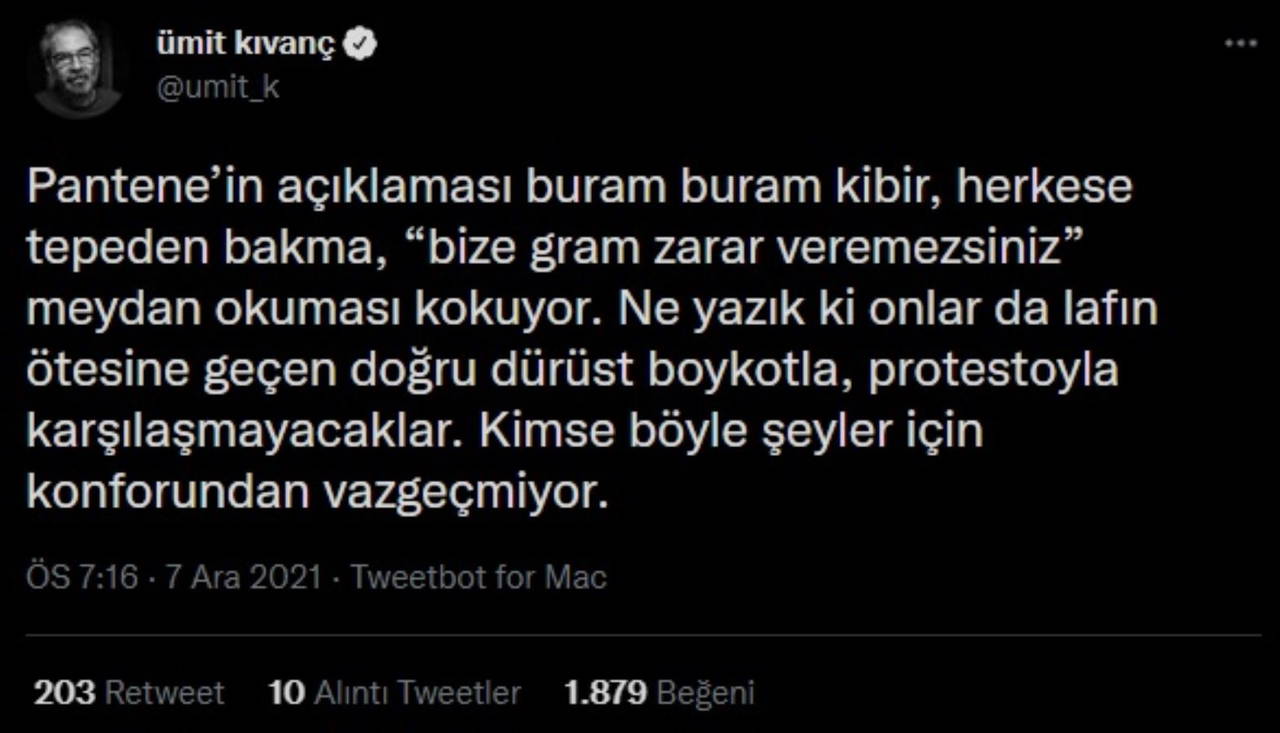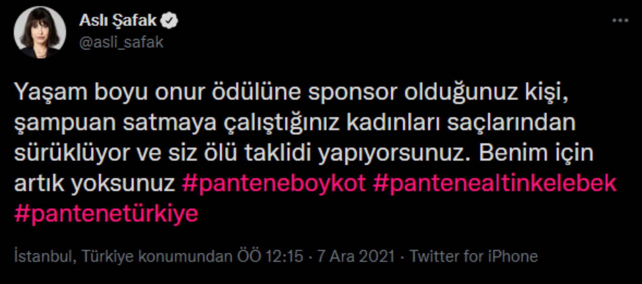 Pantene'in açıklaması sonrası sosyal medyada tepkiler art arda geldi. Aralarında ünlü isimlerin de olduğu pek çok kullanıcı ve kadın örgütü, şirket tarafından yapılan açıklamayı kınadı.