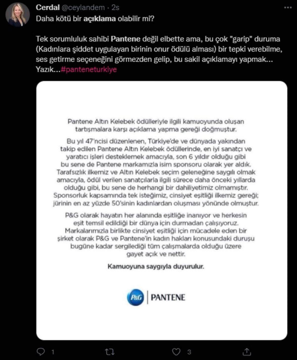 Son olarak tepkilerin ardından Pantene'den açıklama gelmişti. Şirketin Instagram hesabı üzerinden yazılı bir açıklama yayınlanarak 'ödül verilen sanatçılarla ilgili bir dahiliyetin olmadığı' kaydedilmişti.