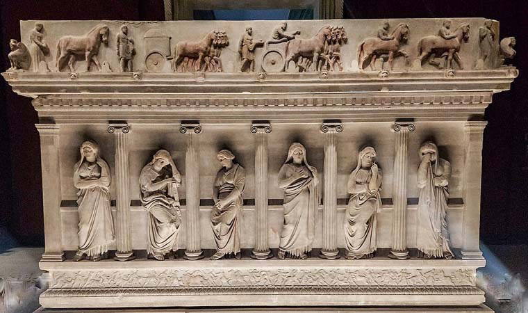 Yaklaşık MÖ 350 yıllarına tarihlenen lahdin, Klasik Dönem Yunan stilinde üretilmiş olduğu ve Atina veya Rodos atölyelerinde üretildikten sonra Sidon’a getirildiği düşünülür. Tüm yüzlerine toplam on sekiz İon düzeni sütun arasında, çeşitli şekillerde tasvir edilmiş, yas tutan kadınlar yerleştirilmiştir.