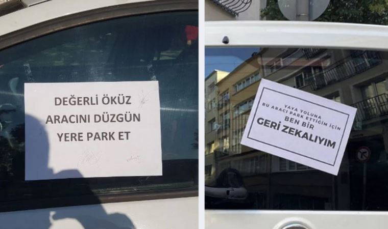 üzerine 'Değerli öküz, aracını düzgün yere park et' yazarak otomobilin camına