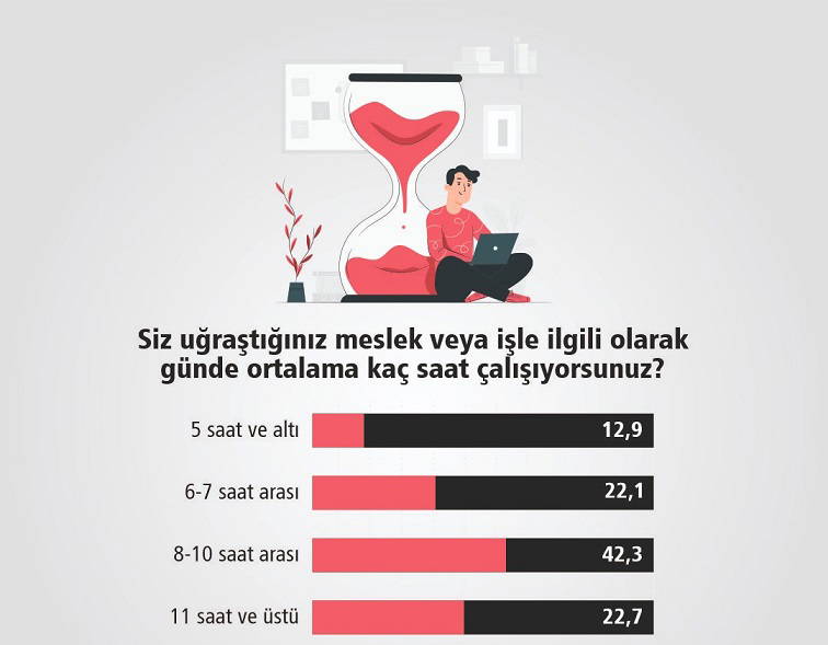 Areda’nın yönelttiği “Siz uğraştığınız meslek veya işle ilgili olarak günde ortalama kaç saat çalışıyorsunuz?” sorusuna yanıt veren katılımcıların yüzde 42,3’ü gün içerisinde 8 ila 10 saat arasında çalıştıklarını ifade etti. Yüzde 22,7’lik orana sahip kişilerin ise 11 saatten fazla sürede çalıştığı dikkat çekti. Buna bağlı olarak, Türkiye’de resmi çalışma süresinden daha uzun çalışma söz konusu. Ayrıca, erkeklerin 49,9’luk bir oranla, kadınlara göre daha fazla günlük çalışma temposuna sahip olduğu sonucuna varıldı. Gençlerin ise, orta ve ileri yaştaki katılımcılara göre, günlük daha uzun çalışma temposuna sahip olduğu ortaya çıktı.