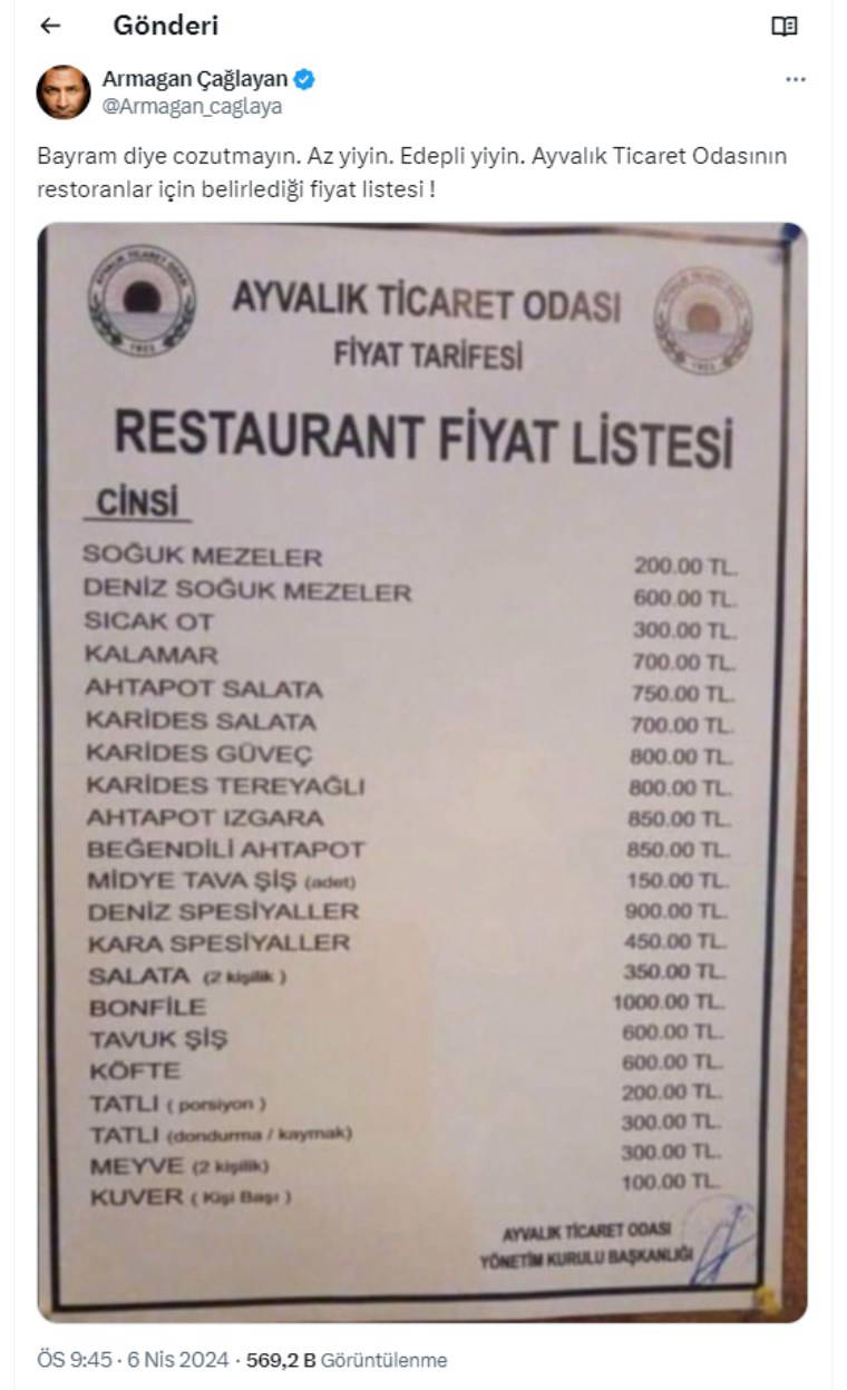 Listeyi X hesabından paylaşan Çağlayan, "Bayram diye cozutmayın. Az yiyin. Edepli yiyin. Ayvalık Ticaret Odası'nın restoranlar için belirlediği fiyat listesi" ifadelerini kullandı.
