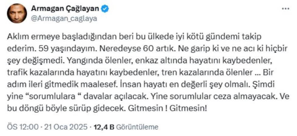 Soruşturma safhasına vurgu yapan Armağan Çağlayan, "İnsan hayatı en değerli şey olmalı. Şimdi yine 'sorumlulara' davalar açılacak. Yine sorumlular ceza almayacak. Ve bu döngü böyle sürüp gidecek. Gitmesin! Gitmesin!" ifadelerini kullandı.
