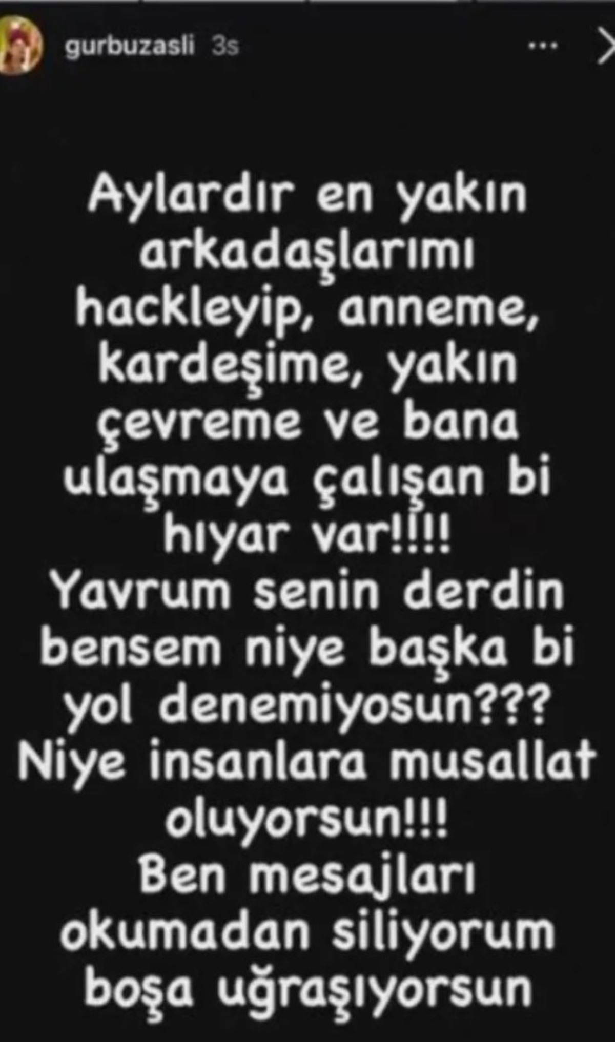 "Aylardır en yakın arkadaşlarımı hackleyip, anneme, kardeşime, yakın çevreme ve bana ulaşmaya çalışan bir hıyar var! Yavrum senin derdin bensem niye başka bir yol denemiyorsun. Niye insanlara musallat oluyorsun! Ben mesajları okumadan siliyorum boşa uğraşıyorsun."
