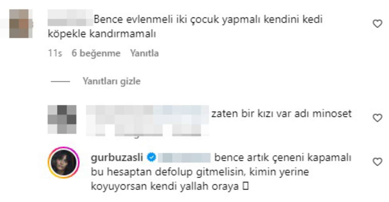 Gürbüz'ün paylaşımına yorum yapan bir kullanıcı da "Bence evlenmeli. İki çocuk yapmalı. Kendini kedi, köpek ile kandırmamalı" dedi.