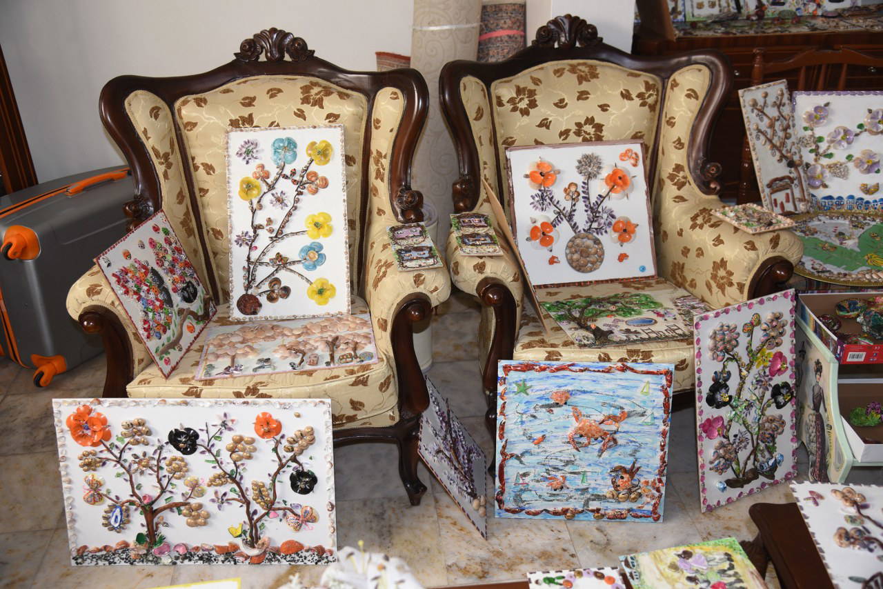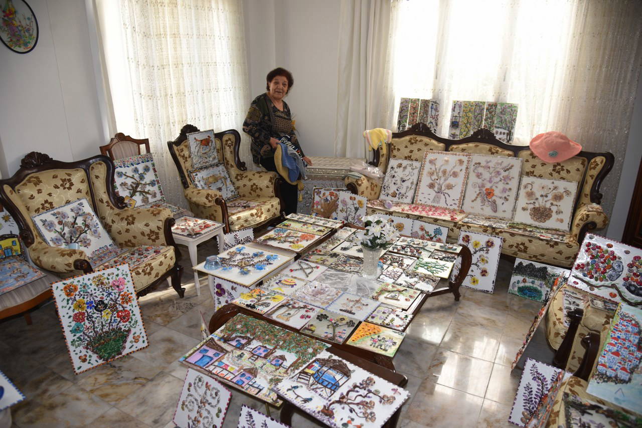- Eş, dost, akrabaya bunları dağıttım, hediye ettim. Kullansınlar, sevinsinler istedim. Sonra örgü işi de sıkıcı olmaya başladı. Kollarıma sinir sıkışmasından dolayı rahatsızlıklar başladı. 'Ne yapayım' diye düşünmeye başladım. Sahilde deniz kabuklarını boyamaya başladım. Onlardan çiçek, insan, hayvan figürleri yapmaya başladım, kabaklar boyadım. Baktım ki onlar da çok güzel oluyor. Bundan sonra çalışmalarımı ihtiyacı olan öğrencilere satabilirsem eğer, çocuklara bir faydam dokunsun istiyorum. Çalışmalarım odaları doldurdu. Koyacak yer bulamaz oldum."