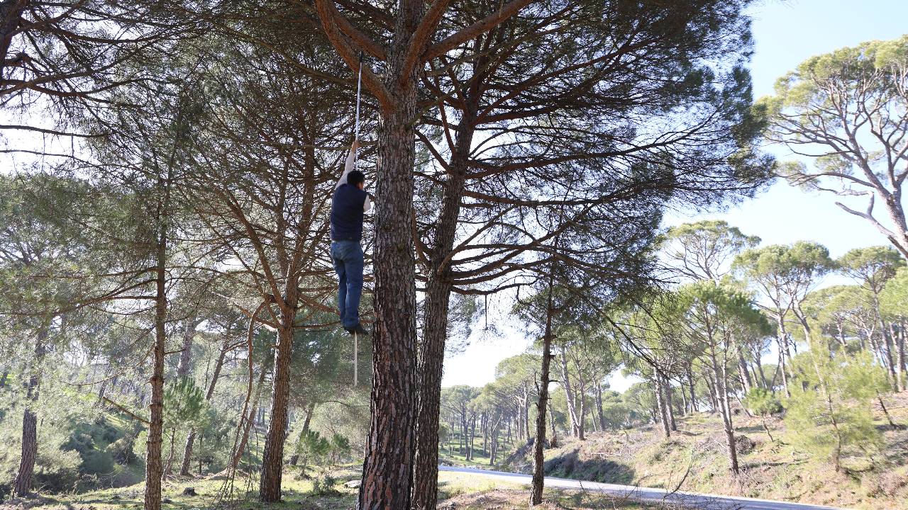 Son yıllarda Aydın'da dağlık alanlarda sıkça dikilip yetiştirilmeye başlanan çam fıstığı hem çiftçilerin hem de çalışanların yüzünü güldürüyor. Toptan olarak kilosu 3 bin TL'den satılan fıstık çamlarının bir tek kozalağı bile altın değerinde olurken yaklaşık 30-35 metre yüksekliğe sahip çam ağaçlarının tepesinde bulunan kozalakları toplamak da oldukça zor ve tehlikeli. İşçilerin maharetli bir şekilde metrelerce yükseklikteki ağaçlara tırmanışları ise görenleri şaşırtıyor. Adeta bir komando gibi ağaçlara rahat bir şekilde çıkan ve üzerinde gezinen işçiler, tehlikeli olsa da işini severek yapıyor.