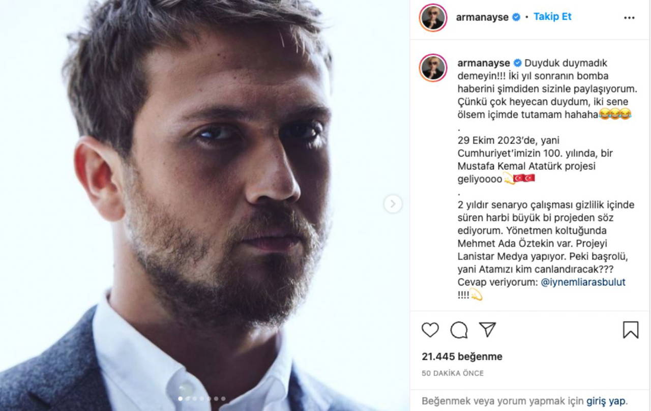 "Duyduk duymadık demeyin!!! İki yıl sonranın bomba haberini şimdiden sizinle paylaşıyorum. Çünkü çok heyecan duydum, iki sene ölsem içimde tutamam. 29 Ekim 2023’de, yani Cumhuriyet’imizin 100. yılında, bir Mustafa Kemal Atatürk projesi geliyor.