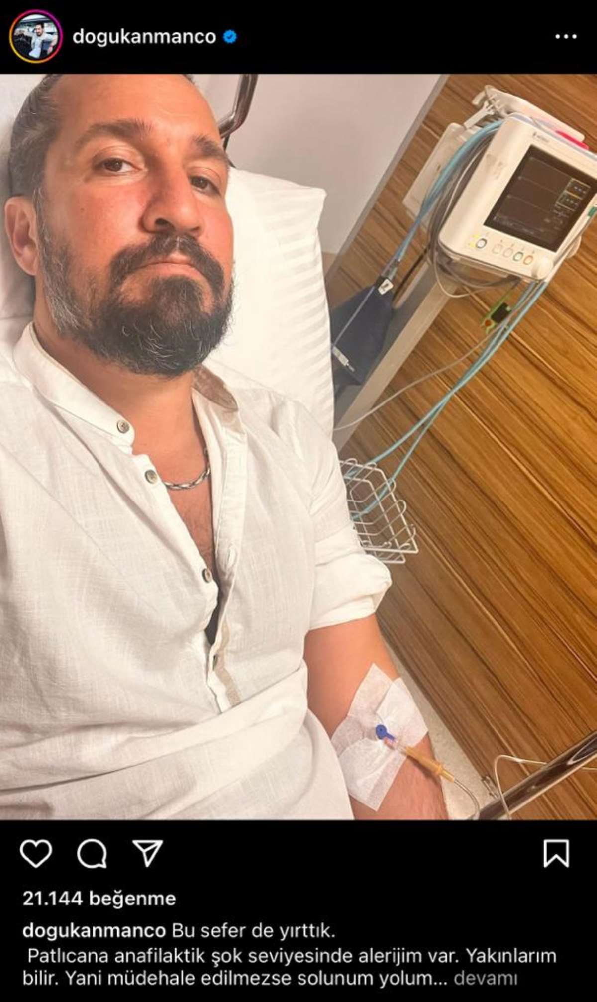 Barış Manço'nun oğlu Doğukan Manço, katıldığı bir düğünde yediği yemek nedeniyle hastanelik oldu. Hastane odasından fotoğraf paylaşan Manço, gıda alerjisi olduğunu söyledi.
