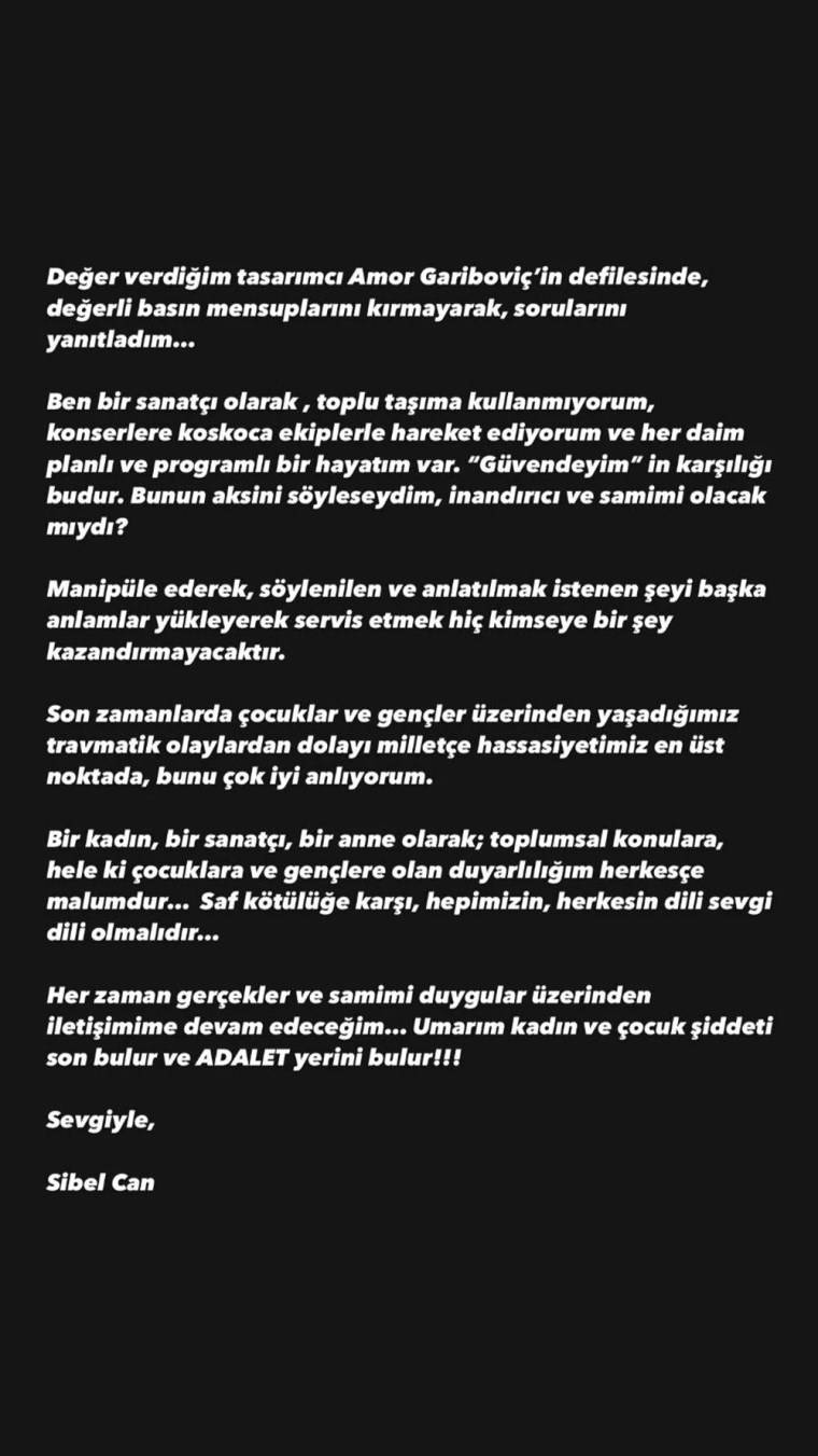 Sibel Can, sözlerine "Değer verdiğim tasarımcı Amor Gariboviç'in defilesinde, değerli basın mensuplarını kırmayarak sorularını yanıtladım... Ben bir sanatçı olarak, toplu taşıma kullanıyorum, konserlere koskoca ekiplerle hareket ediyorum ve her daim planlı ve programlı bir hayatım var. 'Güvendeyim'in karşılığı budur. Bunun aksini söyleseydim, inandırıcı ve samimi olacak mıydı?" diye açıklık getirdi.
