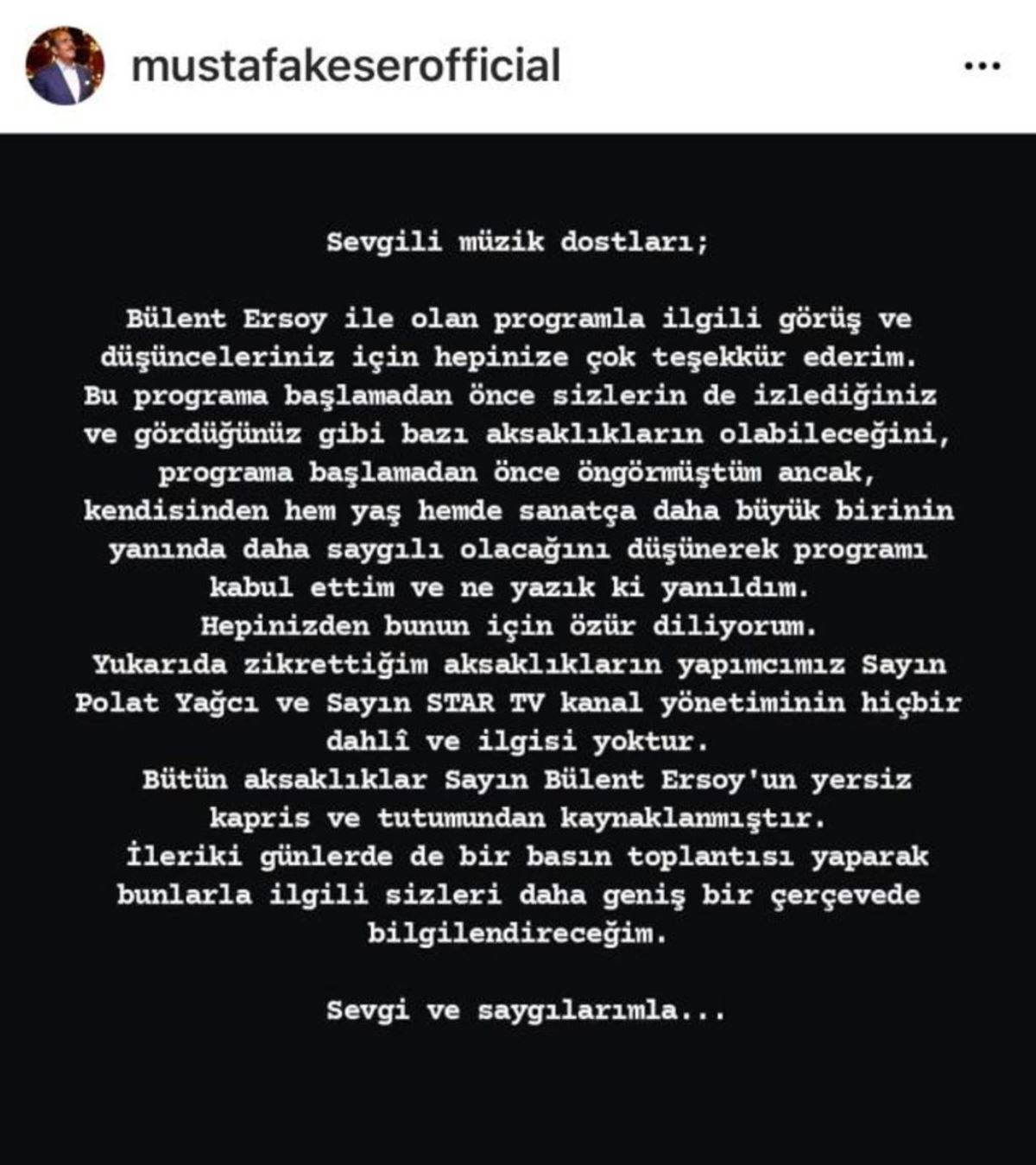 "Bütün aksaklıklar sayın Bülent Ersoy'un yersiz kapris ve tutumundan