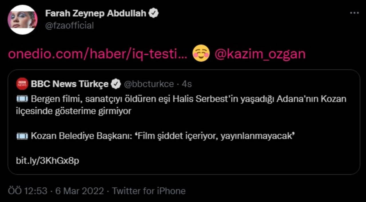 Kişisel Twitter hesabından Özgan’ın açıklamalarını alıntılayan Abdullah, Özgan’a ‘IQ testi’ gönderdi. Ünlü oyuncu, paylaşımına Özgan’ı da etiketledi. Abdullah’ın paylaşımı kısa sürede yüzlerce beğeni aldı.