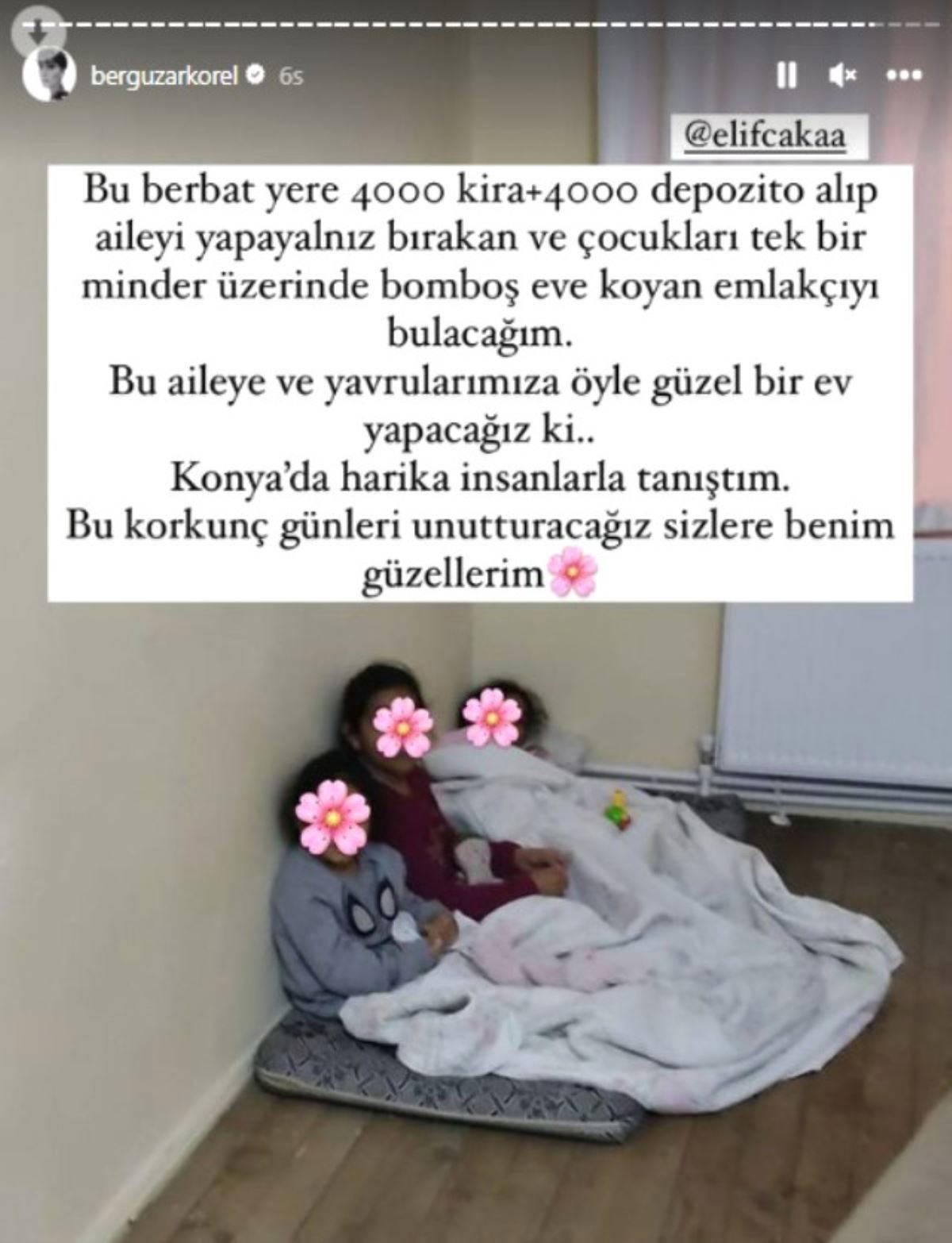 İşin peşini bırakmayacağını ve aile için daha güzel bir ev arayışında olduğunu söyleyen Bergüzar Korel, "Aileyi yapayalnız bırakan, çocukları tek bir minder üzerinde bomboş eve koyan emlakçıyı bulacağım. Bu aileye ve yavrularımıza öyle güzel bir ev yapacağız ki... Bu korkunç günleri unutturacağız sizlere benim güzellerim" ifadelerini kullandı.