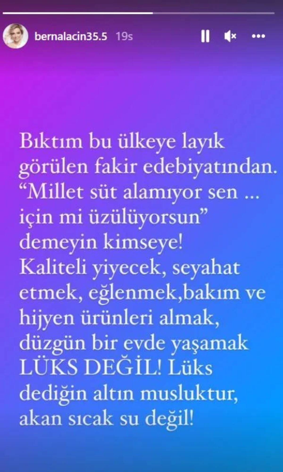 "Bıktım bu ülkeye layık görülen fakir edebiyatından. 'Millet süt alamıyor sen … için mi üzülüyorsun' demeyin kimseye! Kaliteli yiyecek, seyahat etmek, eğlenmek, bakım ve hijyen ürünleri almak, düzgün bir evde yaşamak LÜKS DEĞİL! Lüks dediğin altın musluktur, akan sıcak su değil!"