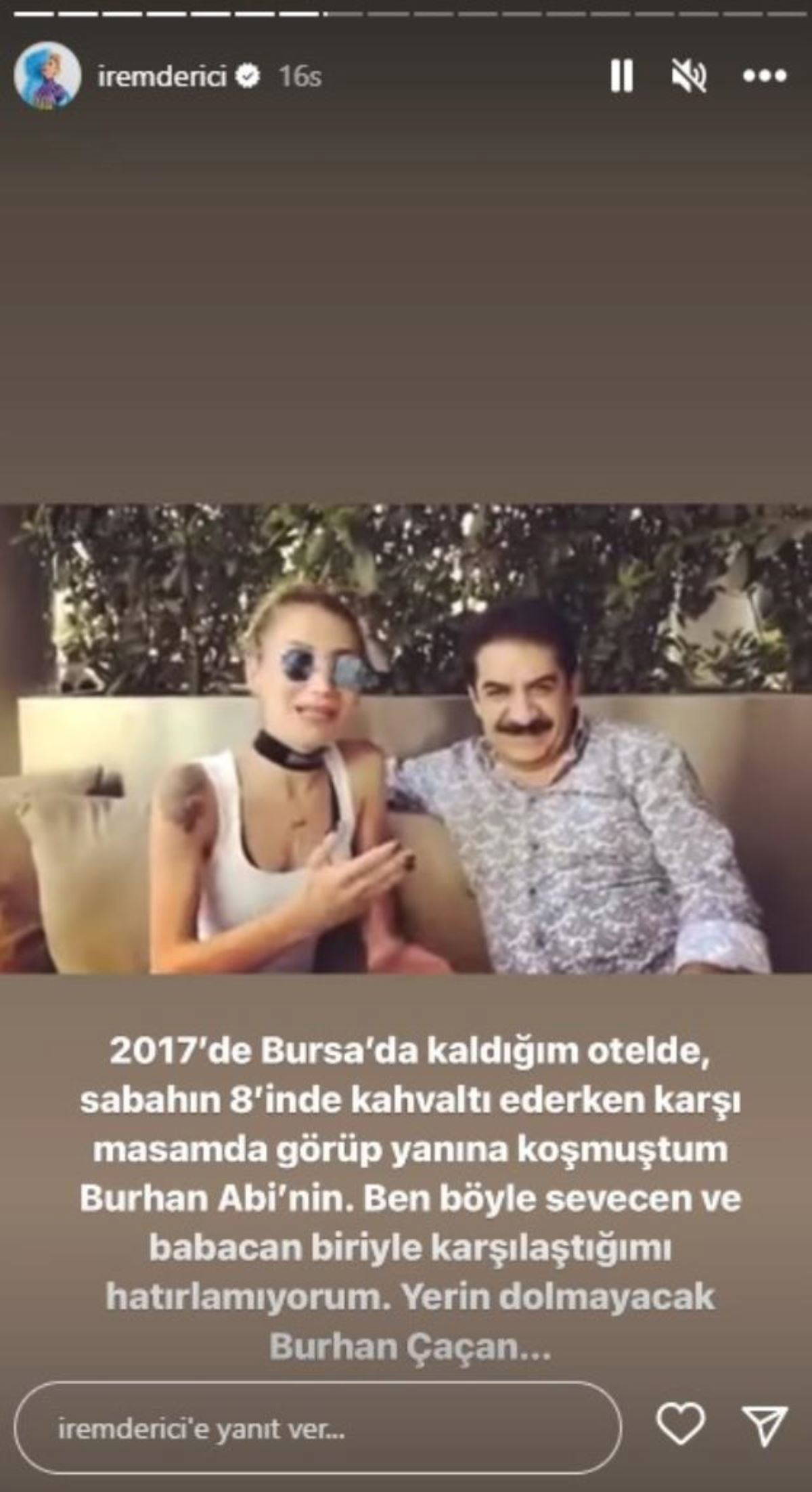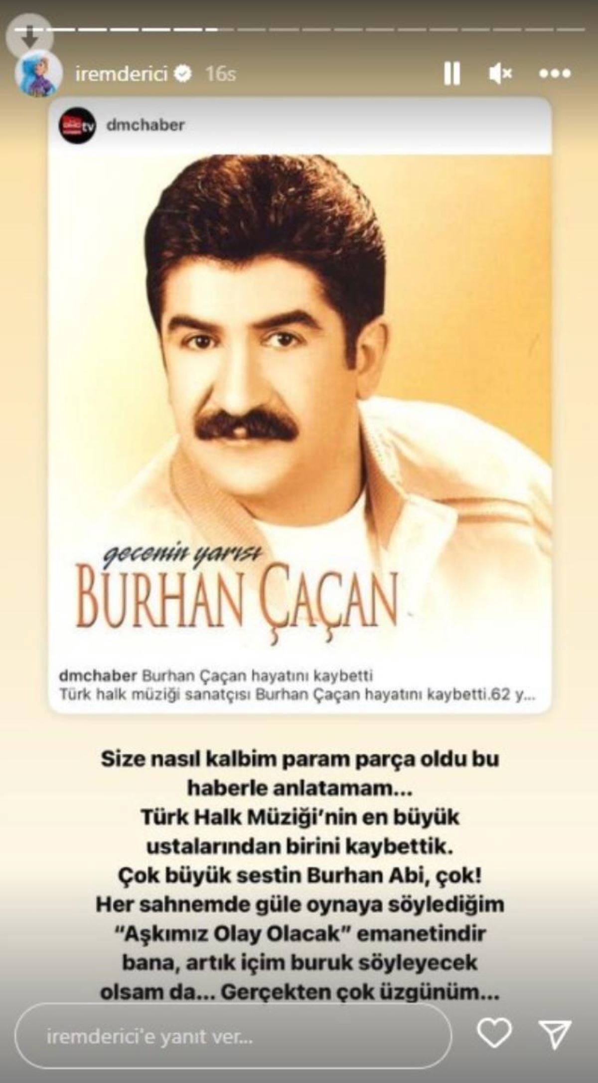 Uzun zamandır Çaçan'ın "Aşkımız Olay Olacak" şarkısını söyleyen İrem Derici, ölüm haberini aldıktan sonra Instagram hesabından duygusal bir paylaşım yaptı.