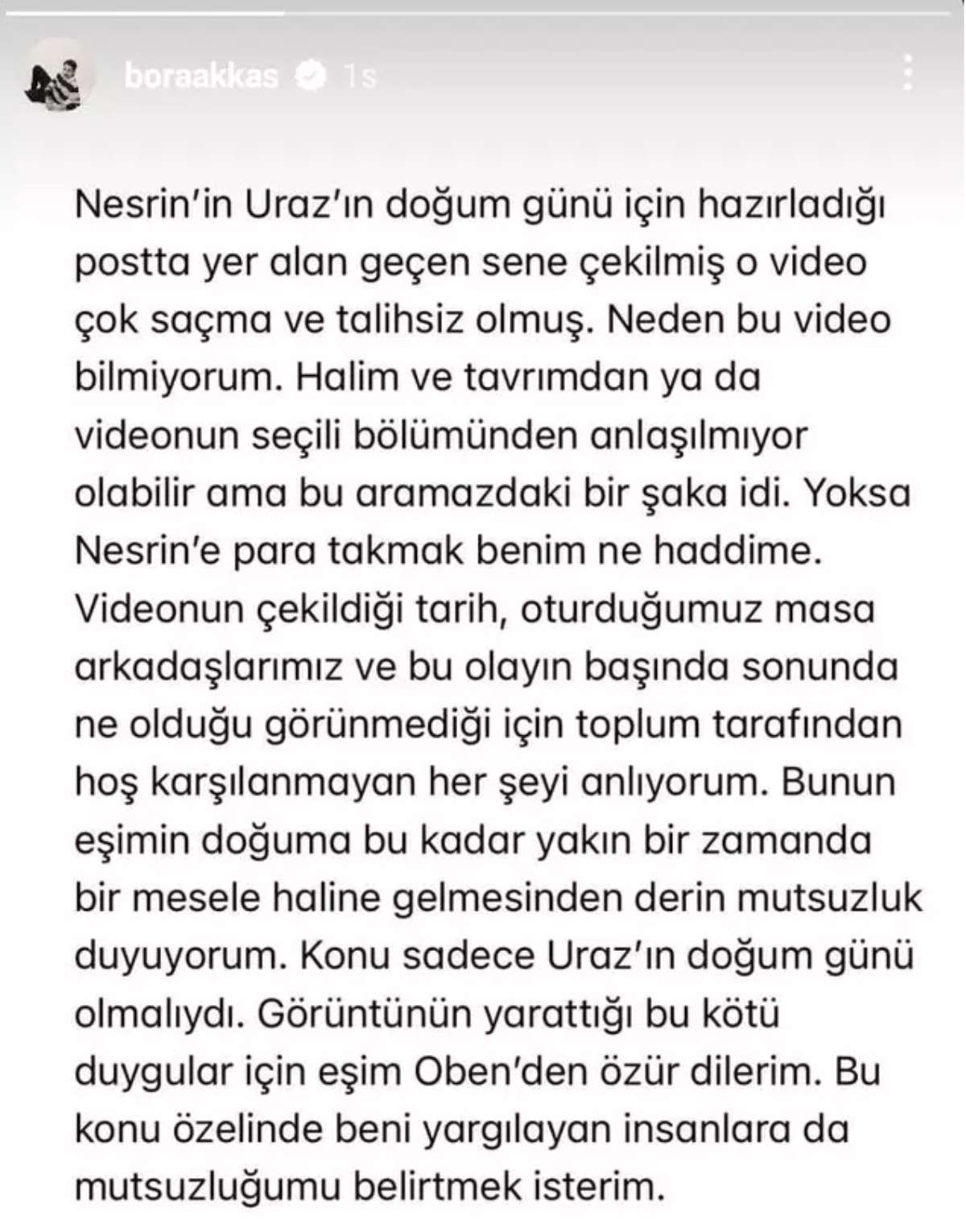 "Nesrin'in Uraz'ın doğum günü için hazırladığı postta yer alan geçen sene çekilmiş o video çok saçma ve talihsiz olmuş. Neden bu video bilmiyorum. Halim ve tavrımdan ya da videonun seçili bölümlerinden anlaşılmıyor olabilir ama bu aramızdaki bir şaka idi."