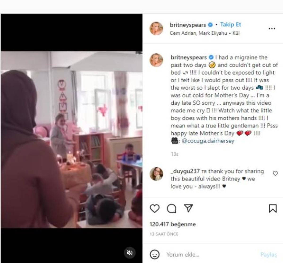 Britney Spears, videoyu 40 milyon takipçisinin bulunduğu Instagram hesabından paylaştı ve "Son iki gündür migrenim tuttu ve yataktan çıkamadım. Işığa maruz kalamadım ve kendimden geçecekmişim gibi hissettim. En kötüsüydü ve bu yüzden iki gün boyunca uyudum. Anneler Günü'nde baygındım… Bir gün geciktim, çok üzgünüm… Neyse, bu video beni ağlattı. Küçük çocuğun annesinin elleriyle ne yaptığını izleyin. Gerçekten küçük bir beyefendi demek istiyorum! Geçmiş Anneler Günü’nüz kutlu olsun" ifadelerini kullandı.