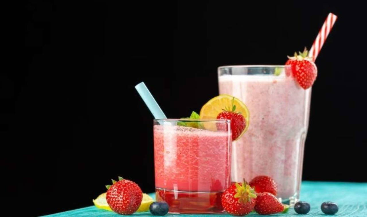 Malzemeler: 10-12 adet donmuş çilek, 1 su bardağı donmuş böğürtlen, 2 su bardağı Hindistan cevizi sütü, istediğiniz kadar buz küpü.