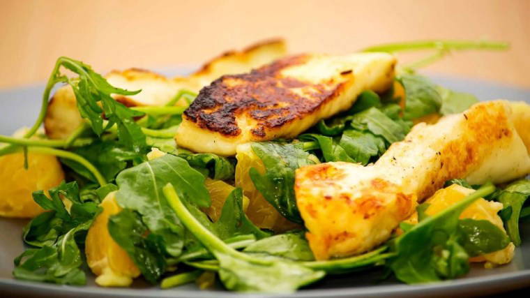 Tüm yeşillikleri bol su ile yıkayıp süzdükten sonra ellerinizle küçük parçalara ayırın. Domatesleri yıkayıp, ikiye bölün. Soğanın kabuklarını soyup ince ince kıyın. Yeşillikleri, domatesleri ve soğanı derin bir salata kabında karıştırın. Hellim peynirini ince ve uzun dilimler halinde kesin.Izgara ya da tavada kızartın. Cevizleri dilediğiniz boyutları getirin. Cevizleri ve kızaran hellim peynirlerini salatanıza ilave edin. Sos malzemelerini küçük bir kapta çalkalayarak iyice karıştırın ve tüm salatanın üzerine gezdirdikten sonra afiyetle tüketin!