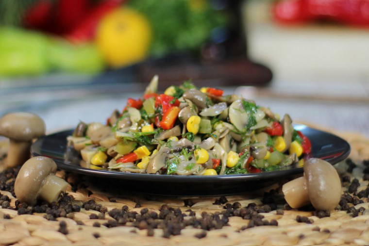 Mantarları yıkamadan, dış kısmını soyup temizleyin. Mantarları ince ince doğrayın. Bir tencereye haşlama suyunu ve mantarları ekleyin. Üzerine limon suyunu ekleyin ve 10 dakika haşlanmaya bırakın. Mantarları süzüp bir kaba alın. Üzerine doğranmış kapya biberi ve mısırları ilave edin. İnce ince doğranmış taze soğanı ekleyin. İnce kıyılmış dereotunu ekleyin. Küp küp doğradığınız kornişon turşuları da ekleyin. Limonu sıkın ve tüm malzemeleri güzelce karıştırın. Tuzu ekleyin ve tekrar karıştırın. Son olarak zeytinyağını ekleyin. Servis tabağına alın, üzerini dereotu ile süsleyin. Afiyet olsun!