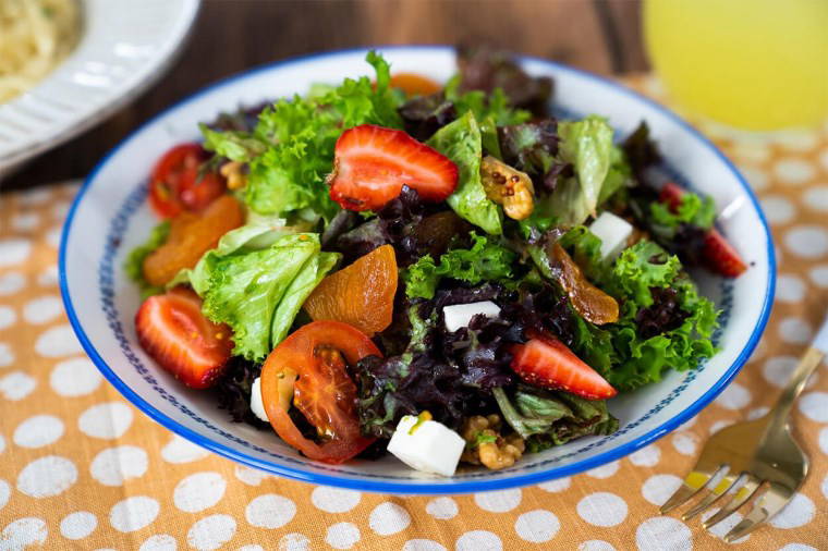 Derin bir kaseye lolorosso ve marulları irice doğrayıp ekleyin. Üzerine çilek, cherry domates ve kayısıları ekleyin. Üzerine cevizleri irice kırıp ilave edin. Sos için; zeytinyağı, limon suyu, hardal, tuz ve karabiberi karıştırın. Salata malzemeleri ile sos malzemelerini birleştirin. Servis yapacağınız kaseye alın. Beyaz peynirleri ekleyin. Afiyet olsun!