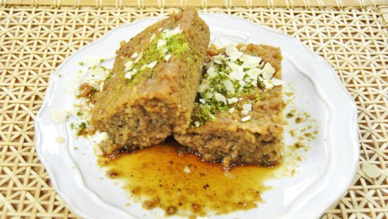 Yoğurmak için derince bir kabın içerisine unu ve kabartma tozunu koyun. Ortasına bir çukur açıp, içerisine yumurta, yoğurt ve tahini ilave edip güzelce yoğurun. Tereyağını bir kapta eritin ve hazırladığınzı hamura, tereyağı biraz ılıklaştıktan sonra azar azar ilave ederek yoğurmaya devam edin. İnce çekilmiş cevizleri de hamura ekleyip, ele yapışmayan bir hamur elde edene dek güzelce yoğurun. Hamur oldukça yağlı olduğu için fırın kabını yağlamanıza gerek yok. Isıya dayanıklı bir fırın kabına hazırladığınız hamuru güzelce bastırıp düzleştirerek yayın. Hamurun üstünü düzleştirdikten sonra çatalla hafifçe delikler açarak desen verin. Ardından dilimleyin ve önceden ısıtılmış 200 derece fırında, üstü kızarana dek 30 dakika pişirin. Tatlı fırından çıkar çıkmaz, henüz çok sıcakken, hazırlamış ve soğumaya bırakmış olduğunuz soğuk şerbeti tatlının üstüne dökün ve kendi kendine şerbeti çekmesi ve soğuması için bırakın. Tatlı tüm şerbeti çekip, soğuduktan sonra, buzdolabında bir süre dinlendirin ve üstünü toz antep fıstığıyla süsleyerek servis edin. Afiyet olsun!
