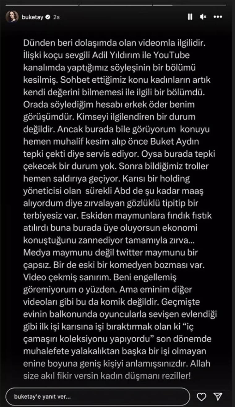 Bu videonun ve Özgür Demirtaş'la yaşadığı polemiğin ardından Buket Aydın sosyal medya hesabından bir açıklama yayınladı. Aydın yaptığı açıklamada Özgür Demirtaş'a 'Twitter maymunu' derken Şahan Gökbakar'ı kadın düşmanı olmakla suçladı.