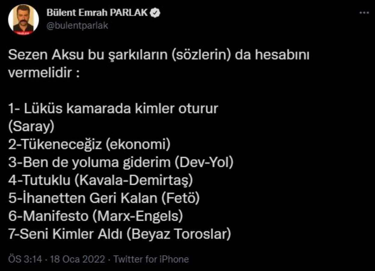 Tartışmalar sürerken; dizi, sinema ve tiyatro oyuncusu Bülent Emrah Parlak'tan esprili bir Sezen Aksu paylaşımı geldi. Parlak, Aksu'nun uğradığı saldırıyı mizahi yolla ele alarak sanatçıyı savundu.