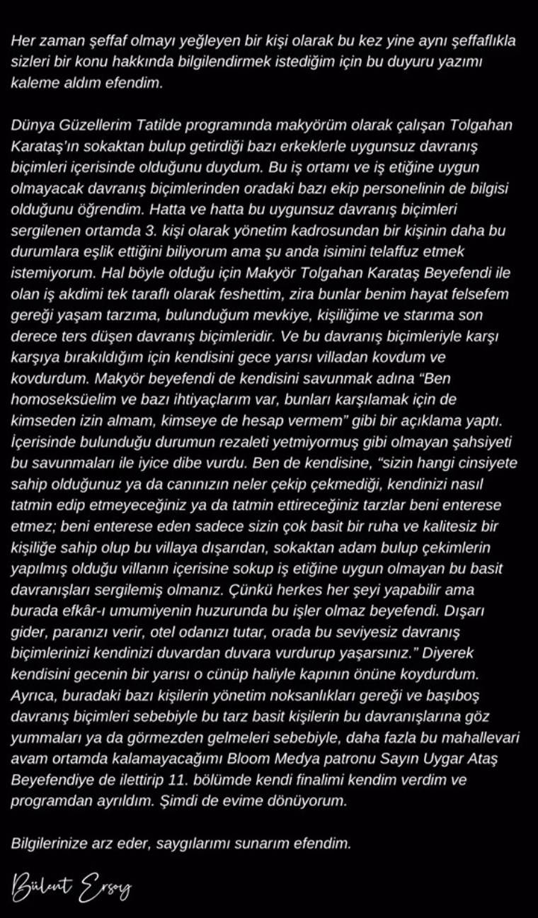 "Her zaman şeffaf olmayı yeğleyen bir kişi olarak bu kez yine aynı şeffaflıkla sizleri bir konu hakkında bilgilendirmek istediğim için bu duyuru yazımı kaleme aldım efendim. Dünya Güzellerim Tatilde programında makyörüm olarak çalışan Tolgahan Karataş'ın sokaktan bulup getirdiği bazı erkeklerle uygunsuz davranış biçimleri içerisinde olduğunu duydum."