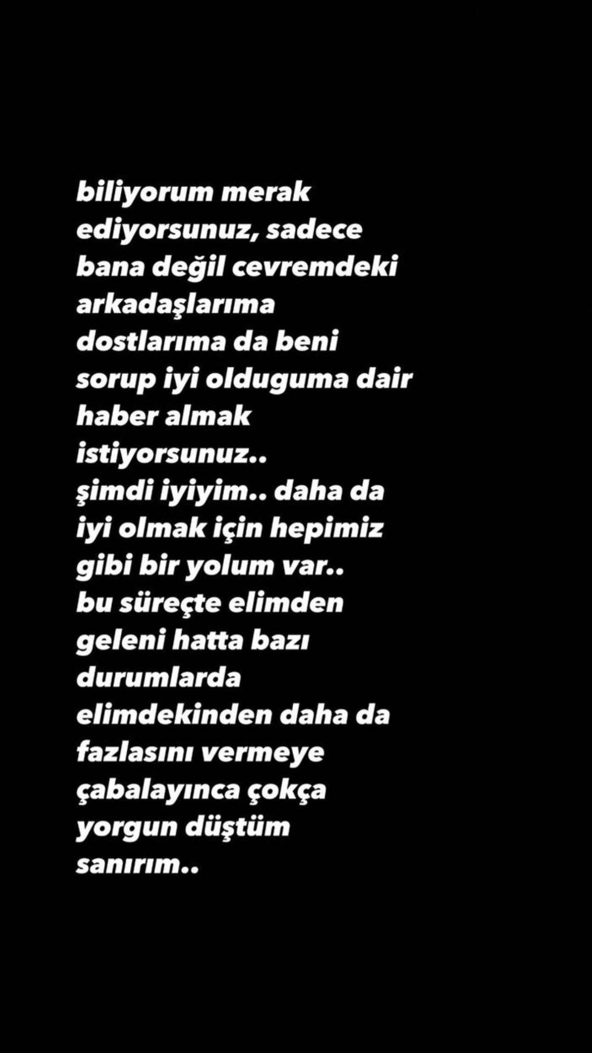 "Beni merak ettiğinizi biliyorum. Şimdi iyiyim. Bu süreçte elimden geleni hatta elimden gelenin fazlasını yapmaya çabalayınca çokça yorgun düştüm.