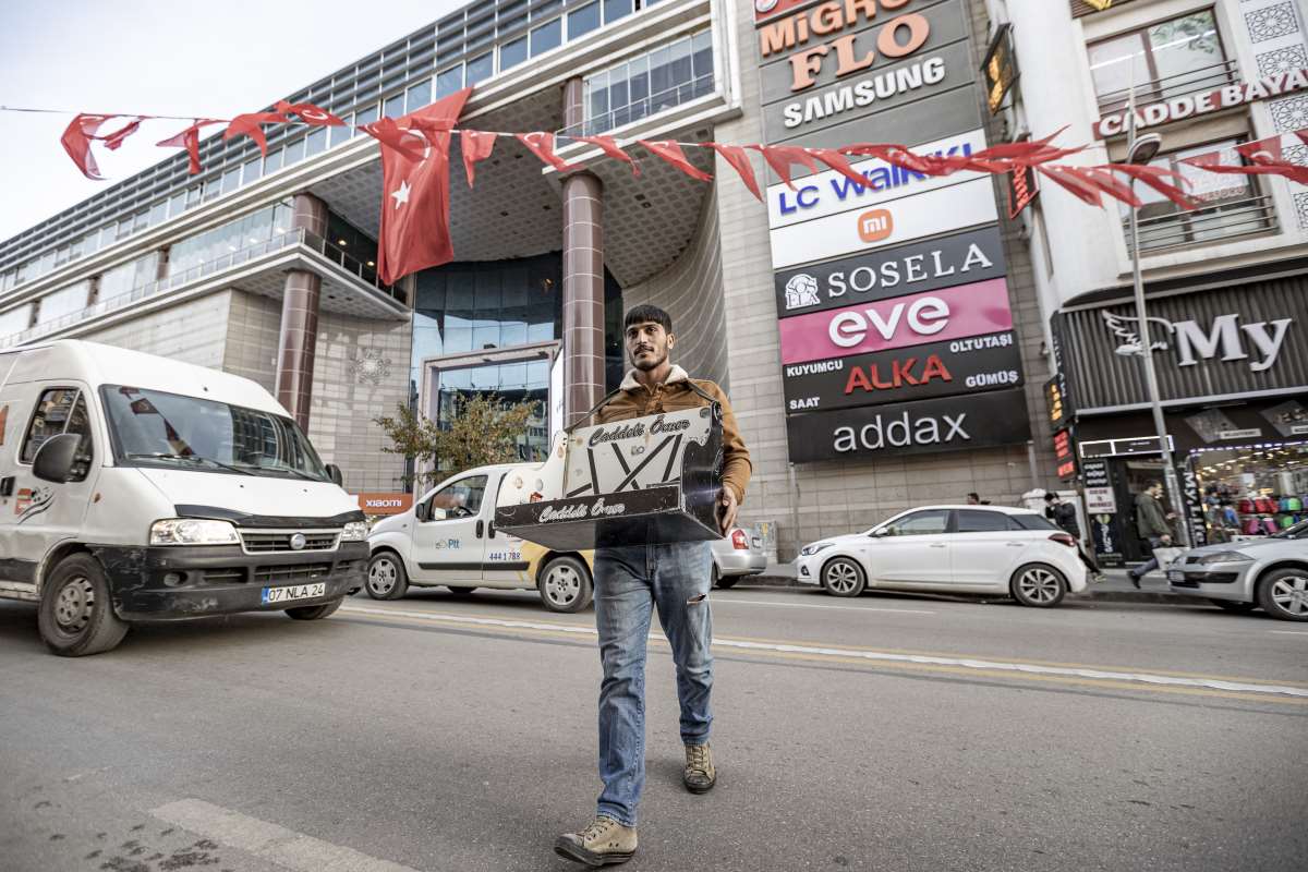 Sabah erken saatlerde tezgahıyla caddeye gelen Demir, gün boyu kentte yaklaşık 40 kilometre yürüyerek satış yapıyor.