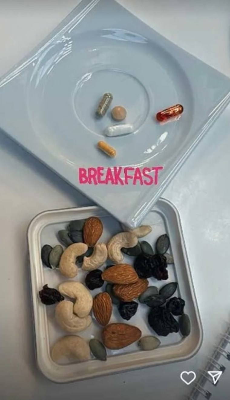 İki çocuk annesi 46 yaşındaki ünlü isim, sabah kahvaltısında tükettiği 5 hap ve 30 kuruyemişten oluşan tabağının fotoğrafını çekerek sosyal medya hesabında paylaştı.