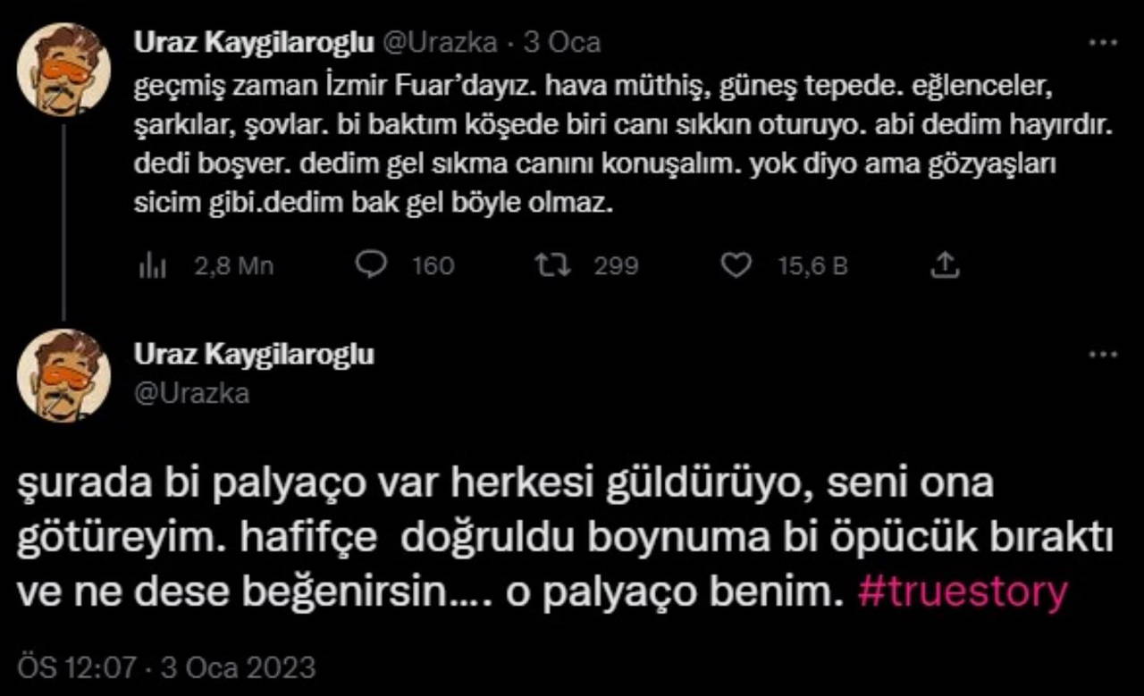 "Geçmiş zaman İzmir Fuar’dayız. Hava müthiş, güneş tepede. Eğlenceler, şarkılar, şovlar. Bir baktım köşede biri canı sıkkın oturuyor. Abi dedim hayırdır? Dedi boşver. Dedim gel sıkma canını konuşalım. Yok diyor ama gözyaşları sicim gibi. Dedim bak gel böyle olmaz. Şurada bir palyaço var herkesi güldürüyor, seni ona götüreyim. Hafifçe doğruldu boynuma bir öpücük bıraktı ve ne dese beğenirsin... O palyaço benim."