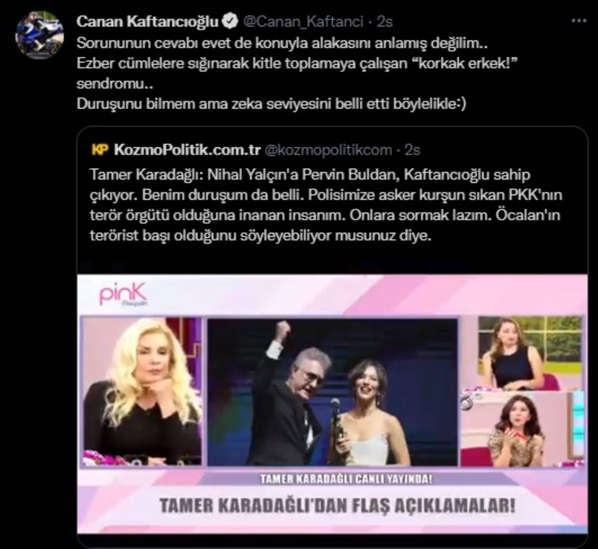 Kişisel Twitter hesabında yaptığı paylaşımda Karadağlı'nın "Nihal Yalçın'a Pervin Buldan, Kaftancıoğlu sahip çıkıyor. Benim duruşum da belli. Polisimize asker kurşun sıkan PKK'nın terör örgütü olduğuna inanan insanım. Onlara sormak lazım. 'Öcalan'ın terörist başı olduğunu söyleyebiliyor musunuz?' diye" şeklindeki ifadesini alıntılayan Kaftancıoğlu, şunları söyledi: