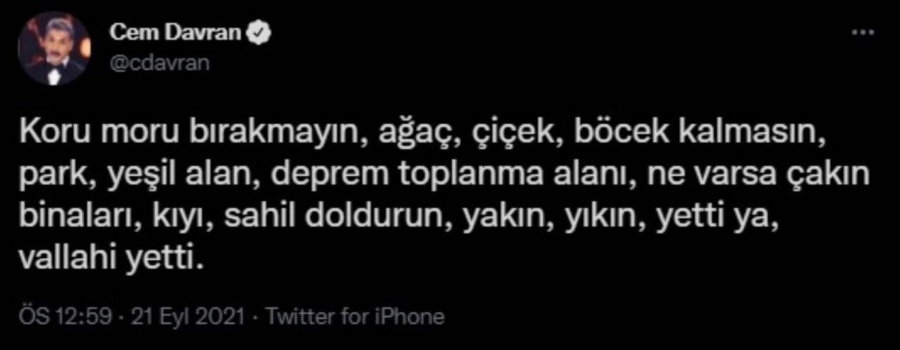 Yaşananlar sosyal medyada da çok büyük tepki çekti. Pek çok kişi AKP'li Üsküdar Belediyesi'nin Validebağ Korusu'na girmesini sert şekilde eleştirirken; ünlü oyuncu Cem Davran'dan da konuya ilişkin bir paylaşım geldi.