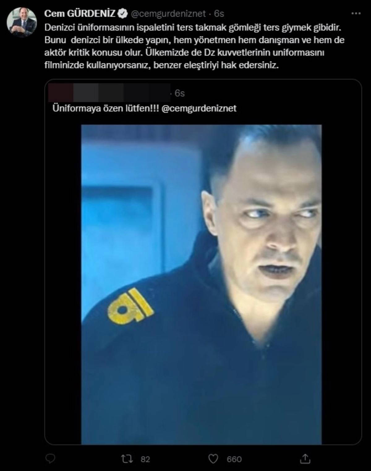 Dizide, denizci üniformasının ispaletinin ters takıldığını söyleyen Gürdeniz, "Denizci üniformasının ispaletini ters takmak, gömleği ters giymek gibidir. Bunu denizci bir ülkede yapın, hem yönetmen hem danışman ve hem de aktör kritik konusu olur. Ülkemizde de deniz kuvvetlerinin üniformasını filminizde kullanıyorsanız, benzer eleştiriyi hak edersiniz" ifadelerini kullandı.