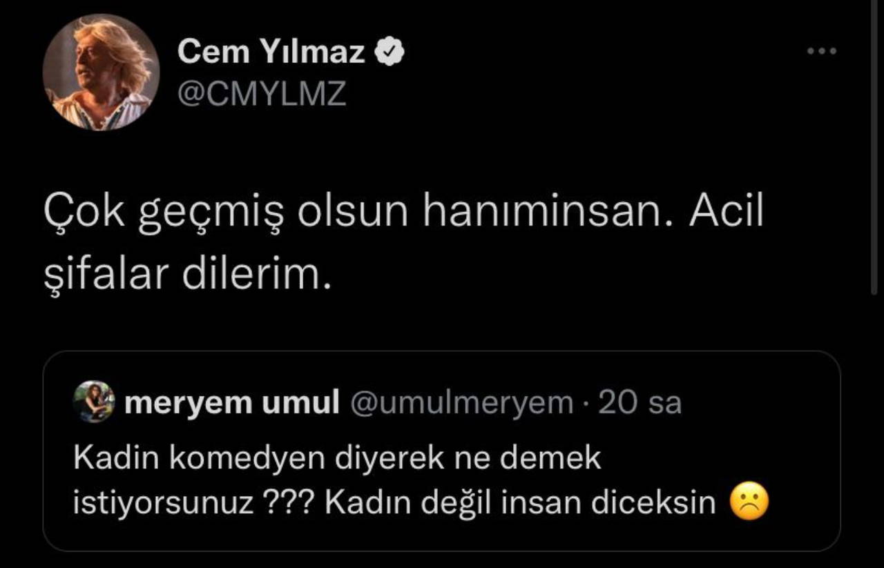 Cem Yılmaz'ın takipçisine yanıtı ise "Çok geçmiş olsun hanıminsan. Acil şifalar dilerim" oldu. Ünlü komedyenin bu yanıtı, sosyal medyada binlerce etkileşim aldı.