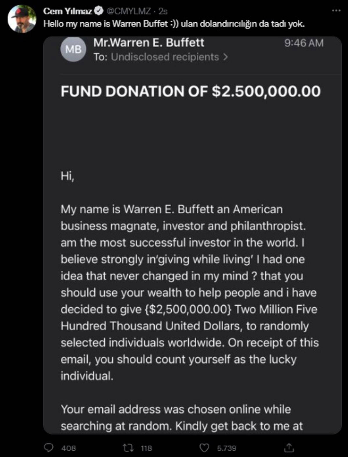 Geçen aylarda Bill Gates’in adını kullanarak kendisini dolandırmaya çalışanların e-mailini paylaşan Cem Yılmaz, bu kez de Amerikalı iş insanı ve hisse senedi yatırımcısı Warren Buffett ismini kullanan dolandırıcıların e-mailini ifşa etti.