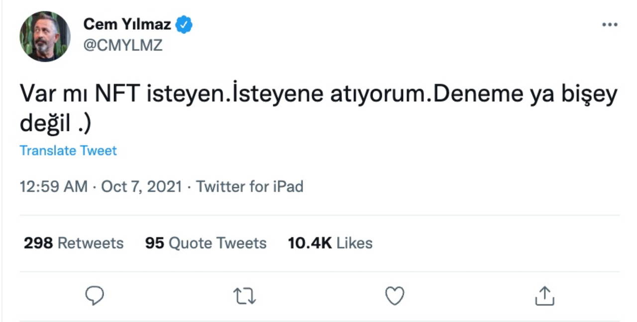 Yılmaz, konuyla ilgili yaptığı açıklamada"Var mı NFT isteyen? İsteyene atıyorum. Deneme ya bir şey değil" ifadelerini kullandı.
