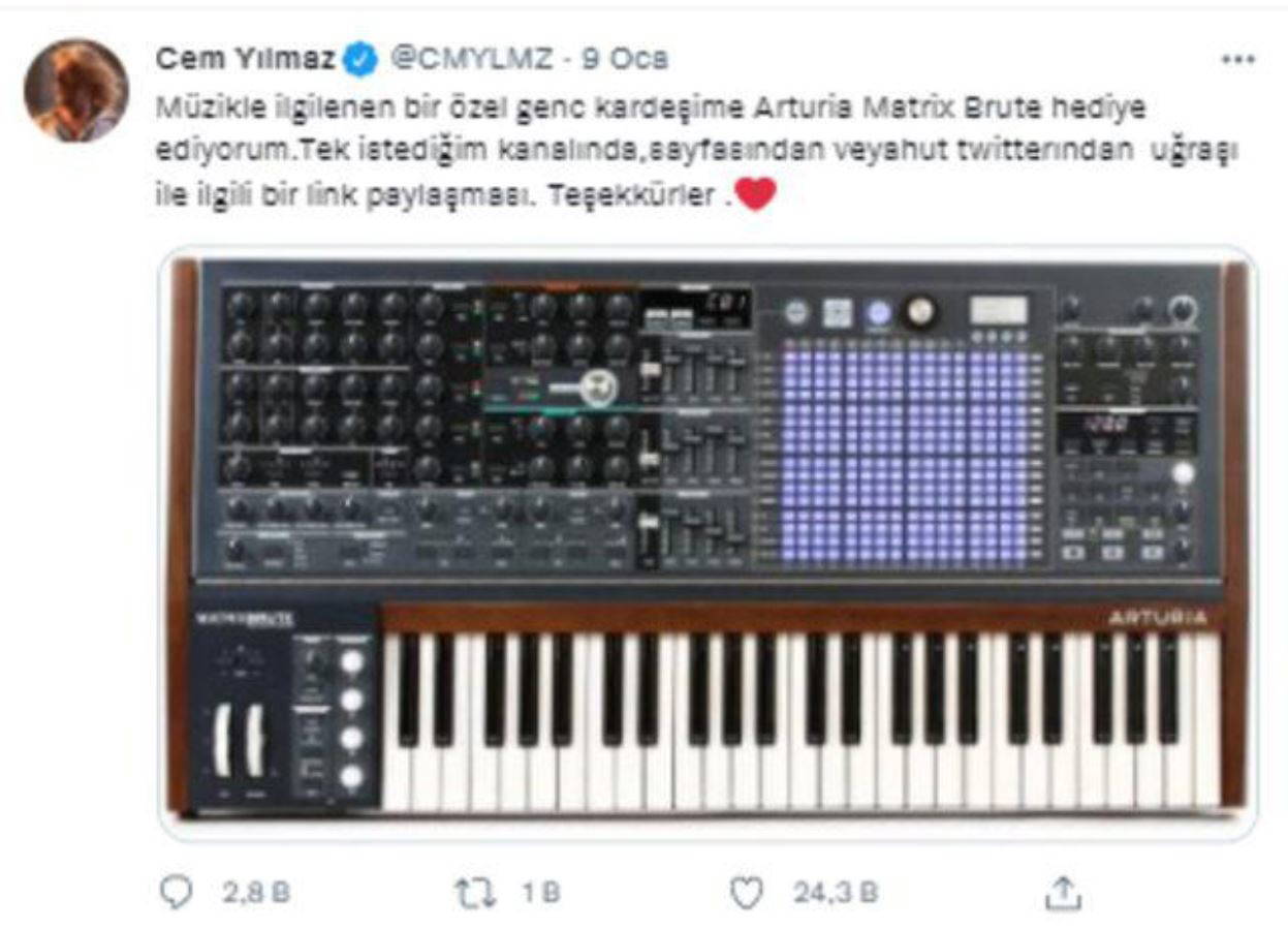Son dönemde sosyal medya hesabı üzerinden yaptığı paylaşımlarla takipçileriyle etkileşim halinde olan Cem Yılmaz, bir hayranına yaptığı jestle gündemde. Yılmaz iki gün önce paylaşım yapan Yılmaz, "Müzikle ilgilenen bir özel genc kardeşime Arturia Matrix Brute hediye ediyorum. Tek istediğim kanalında, sayfasından veyahut Twitter'dan uğraşı ile ilgili bir link paylaşması" notunu yazmıştı.