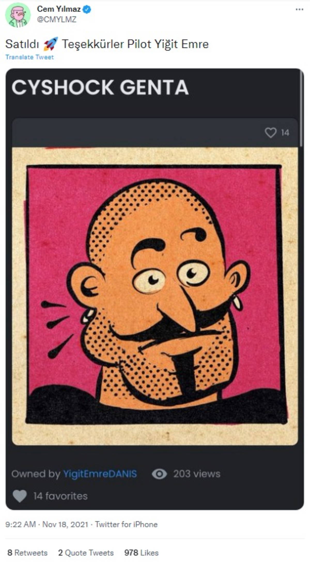 Her bir NFT için 0,25 Ethereum, yani yaklaşık 10 bin Türk Lirası fiyat belirleyen Yılmaz, sadece 7 dakika sonra "Satıldı. Teşekkürler Pilot Yiğit Emre" sözleriyle NFT'lerinden birinin satıldığını açıkladı.
