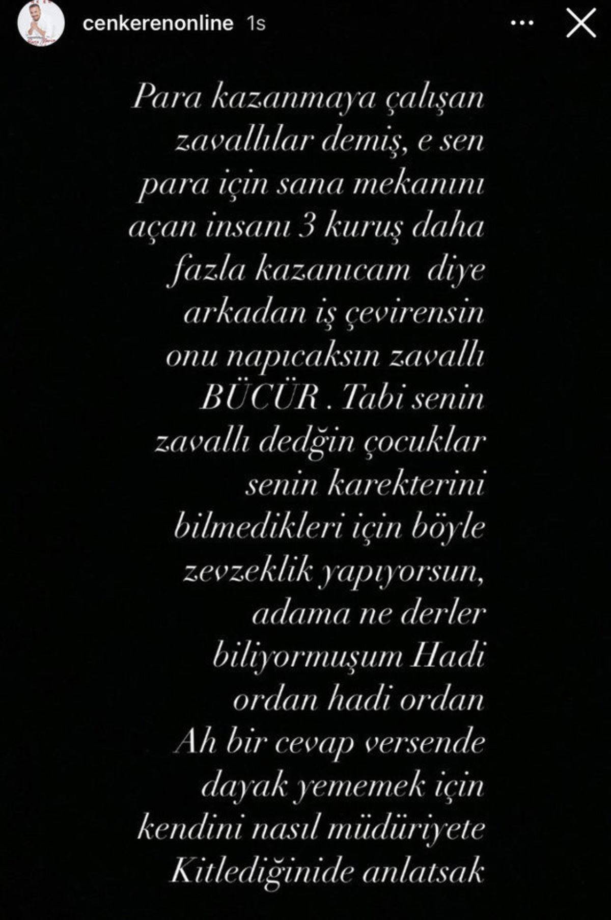 "Para kazanmaya çalışan zavallılar demiş, e sene para için mekanını açan insanı 3 kuruş daha fazla kazanacağım diye arkadan iş çevirensin, onu ne yapacaksın zavallı... Bücür. Tabii senin zavallı dediğin çocuklar senin karakterini bilmedikleri için böyle zevzeklik yapıyorsun, adama ne derler biliyormuşum hadi oradan, hadi oradan... Ah bir cevap versen de dayak yememek için kendini nasıl müdüriyete kitlediğini de anlatsak. Geçmişi unutmamak lazım değil mi? Sana bu cevabı vermek için yedi sene bekledim. Çok sabırlıyımdır intikam değil ama unutmadığını bilmeni istedim. Hadi uğurlar olsun."