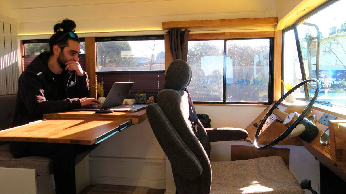 Dünya turuna çıkmak istediği ifade eden Mert, “Evim ve arabam bu okul otobüsü oldu. Başka bir şeye ihtiyacım yok. Dünya turu niyetim var. Normalde Nepal’de yamaç paraşütü eğitmeni olduğum için orada çalışmalarım mevcut. Araçla beraber 6 bin kilometrelik yolu gideceğim. Öncelikle 1 sene kadar Türkiye’de testlerini gerçekleştireceğim. Dün gece Samsun Atakum sahilinde konakladım. Uykuya dalmam gece 04.00’ü buldu. Sürekli insanlar geliyordu. ‘İçine girebilir miyiz, bakabilir miyiz’ diyorlar. Her gelenin baya bir hoşuna gidiyor. Sohbet ediyoruz, kahve ikram veriyorum” diye konuştu.