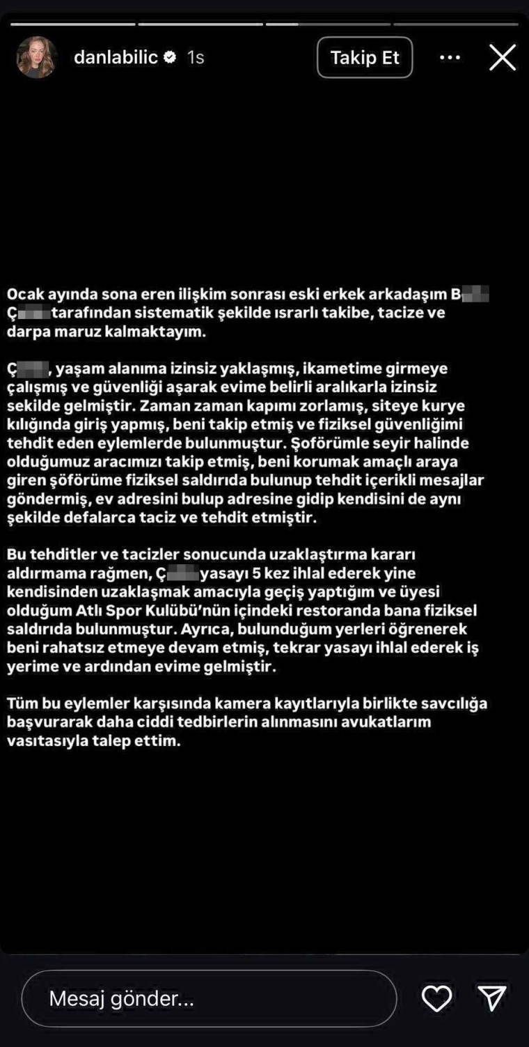 Sosyal medya hesabından olayla ilgili açıklama yapan Danla Bilic, "Ocak ayında sona eren ilişkim sonrası eski erkek arkadaşım B.Ç. tarafından sistematik şekilde ısrarlı takibe, tacize ve darpa maruz kalmaktayım. B.Ç., yaşam alanıma izinsiz yaklaşmış, ikametime girmeye çalışmış ve güvenliği aşarak evime belirli aralıklarla izinsiz şekilde gelmiştir. Zaman zaman kapımı zorlamış, siteye kurye kılığında giriş yapmış, beni takip etmiş ve fiziksel güvenliğimi tehdit eden eylemlerde bulunmuştur. Şoförümle seyir halinde olduğumuz aracımızı takip etmiş, beni korumak amaçlı araya giren şoförüme fiziksel saldırıda bulunup tehdit içerikli mesajlar göndermiş, ev adresini bulup adresine gidip kendisini de aynı şekilde defalarca taciz ve tehdit etmiştir.